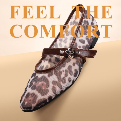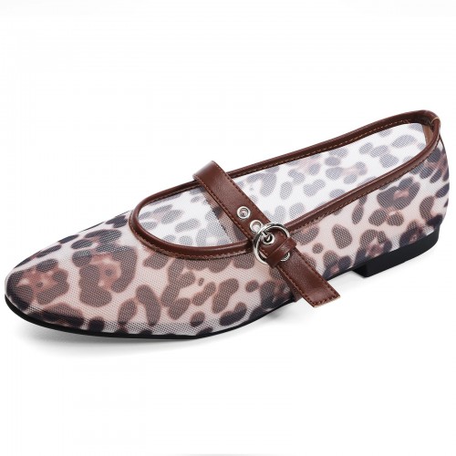 Leopard Flats for Women Mesh Ballet Flats Mary Jane Animal Print Shoes Slip On Casual Breathable Ballerina Flats