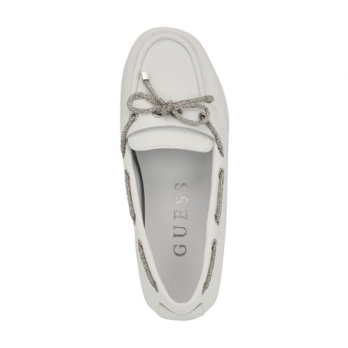 The Guess Lavonta is a tailored boat shoe designed for women, offering a sophisticated and seasonless style. This slip-on shoe features a distinctive rhinestone-embellished lace that adds a glitzy, decorative touch to the classic boat shoe silhouette. Constructed from white leather, it provides a clean and versatile appearance suitable for various casual and smart-casual occasions. The shoe is designed with a tailored fit for a polished look. As part of the Guess brand, established in 1981, it reflects a lifestyle associated with youthfulness and adventure. The product is available in size 6.5M.