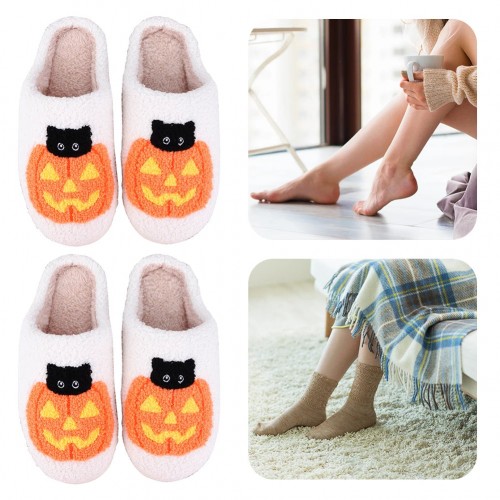 Halloween Pumpkin Cat Slippers Closed Toe Slippers Flat Thermal Slippers Warm Slip-On Unisex House Shoes Winter Halloween Gifts