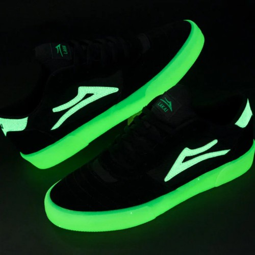 The first glow in the dark pack from Lakai. Normal skate shoes with rubber gum outsoles which glow in the dark.