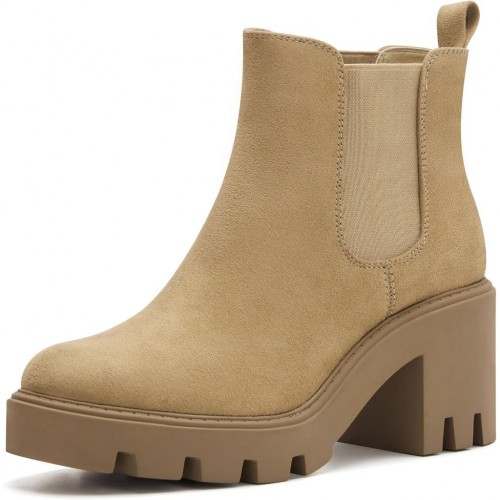 Women’s Chelsea Boots Platform High Heel Ankle Booties – Beige, Size 10