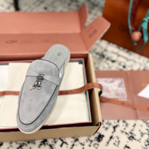 Loro Piana Grey Black Suede Charms Walk Flat Mules