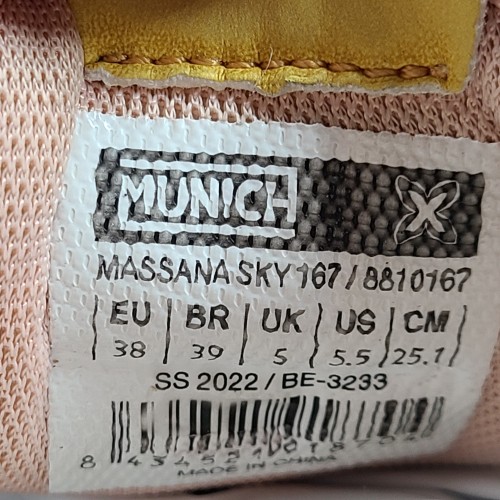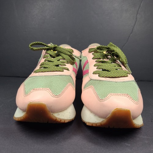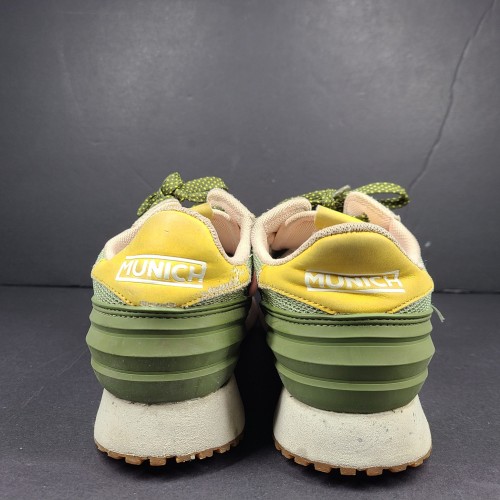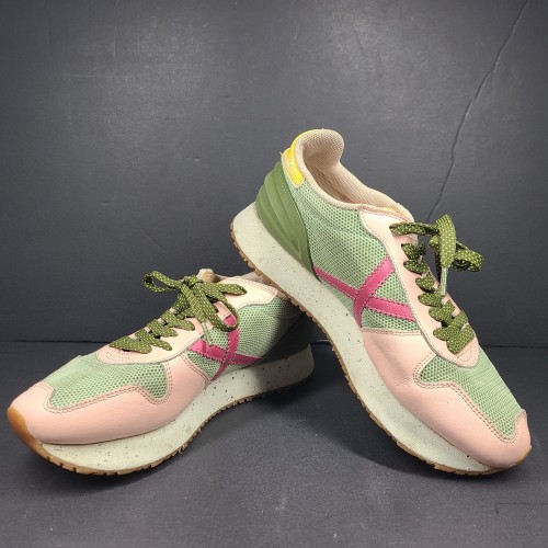Munich women’s sneakers in khaki and pink with platform. Details in magenta, yellow and forest green. Contrast of materials in the cut. Lace up closure. Retro-inspired model with sky sole.