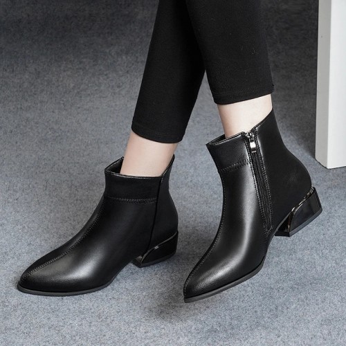 Crafted from polished leather, these ankle boots boast a refined, smooth aesthetic with subtle pointed toes and premium stitching, exuding timeless style. The unique block heel adds a fashionable edge enhancing your chic look. Designed with a plush insole, these boots provide the perfect blend of luxury and practicality. The convenient side zipper closure makes slipping them on and off effortless, while the sleek, flowing lines of the design complete a look that’s both modern and classy.